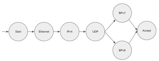 Traditional SDN network operators configure their control plane to manage the behavior of vendor-defined networking switches (the data plane). However, there are no vendor-defined switches that can understand BP. Therefore, processing bundles natively within hardware and creating a SDDTN node requires the capability of a relatively new networking paradigm for network operators: data plane programming. With data plane programming, network operators are able to customize the data plane for their specific use case, e.g., to program a data plane that is able to understand custom protocols. One of the data plane programming languages available is Programming Protocol-independent Packet Processors (P4). With the P4 language, code can be written to program data plane behavior and at compile-time a control plane Application Programming Interface (API) will be generated. Programs written in the P4 language can be compiled for a variety of targets, e.g., ASICs, FPGAs, and software switches, and have been used to implement a large variety of novel networking application in topics such as traffic management and congestion control, routing and forwarding, enabling machine learning, and network security [32]. For a brief overview of how the P4 language works and P4-specific terminology see Appendix A (Also see Available online: https://p4.org/learn/ (accessed on 1 September 2022) for more learning resources). The P4 language’s ability to configure both the data plane and control plane, its open source nature and large ecosystem, and its proven role in creating novel networking applications makes it an attractive choice as a tool to implement a SDDTN node.