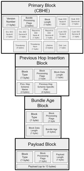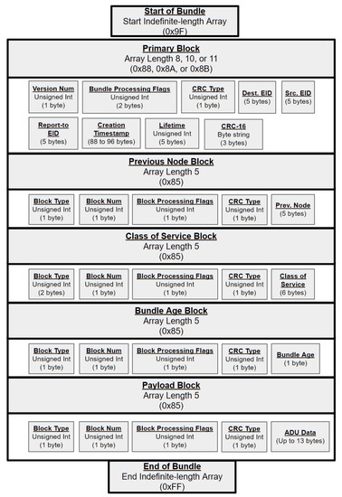 - Burleigh, S. Compressed Bundle Header Encoding (CBHE); RFC 6260; IETF: Fremont, CA, USA, 2011. [Google Scholar] [CrossRef]