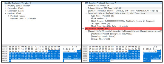 We evaluated the translation capabilities by determining whether Rho and Eta would be able to communicate in their respective bpchat programs despite being DTN nodes utilizing different versions of the BP. From the end user perspective, this was a success as Rho and Eta could interactively chat in bpchat without any sign of an error (as long as each message was kept to under 14 bytes long). However, upon further inspection of the packet captures, shown in Figure 11 and Figure 12, we sometimes saw a “Malformed Packet” error displayed in Wireshark in the BPv6 to BPv7 translation that may be caused by a slight formatting error from the translator’s output bundle mismatching a detail in the BP specification. Despite this, the end node was still able to receive and decode the translated bundle. Additionally, Wireshark marked a BPv7 extension block in yellow to indicate an unknown node; this was due to ION using an unofficial extension block type. An important aspect to note is that IPv4 and UDP checksums were properly updated, which was required for the end-nodes to properly receive the bundle.