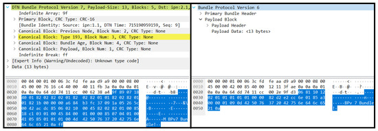 Alongside an encoding change, a couple of components were relocated away from the official BP specification in BPv7 and may be moved to other sections of the DTN protocol suite. One feature moved away from BP in BPv7 is class of service [11]. BPv6 bundles were able to request a certain class of service through bundle processing flags in the primary block, such as bulk, normal, or expedited class of service [10]. According to an Internet Engineering Task Force (IETF) draft (See the Bundle Protocol Extended Class of Service draft: Available online: https://datatracker.ietf.org/doc/html/draft-burleigh-dtn-ecos-00, accessed on 1 September 2022), class of service may be handled as a BPv7 extension block. Another feature moved away from the BPv7 specification is custody transfer, also implemented through bundle processing flags, which is used to request another node to take responsibility for a given bundle. An IETF draft indicates that custody transfer may be placed within the bundle-in-bundle encapsulation (BIBE) specification (See the Bundle-in-Bundle Encapsulation draft: Available online: https://datatracker.ietf.org/doc/html/draft-ietf-dtn-bibect-03, accessed on 1 September 2022).