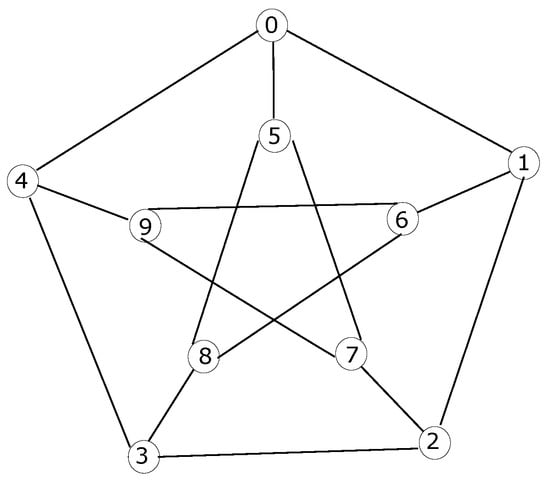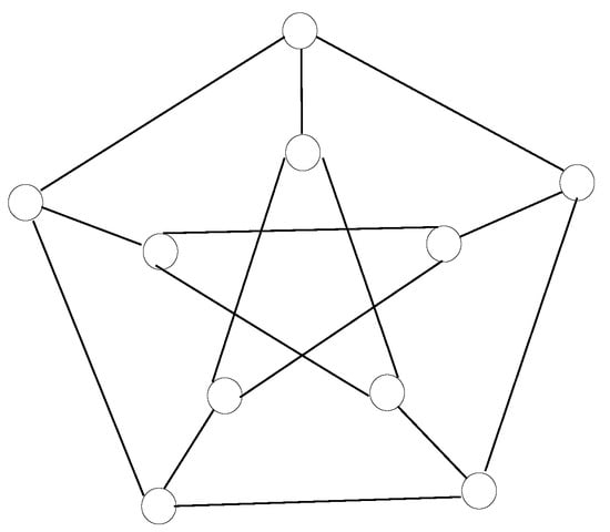 The outer circle belongs to a pentagon, such that the counterclockwise link from a particular node i connects to node , whereas its clockwise link leads to node . Additionally, the inner circle belongs to a pentagonal star, such that the counterclockwise link from a given node i heads for node , while its clockwise link heads for node . Furthermore, the opposite link from a particular node i always results in , although it leads to node , being located in the opposite circle (outer or inner).