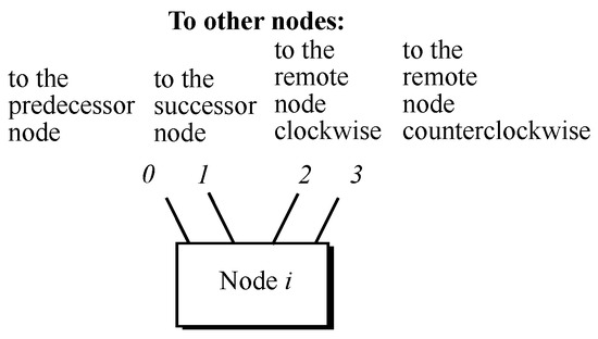Once the node identification scheme is established, the ports going from a particular node i to its neighboring nodes need to be identified as well, as depicted in Figure 4, where the predecessor node is the one linked through the counterclockwise link, namely port 0; the successor node is the one linked through the clockwise link, namely port 1; and the opposite node is the one located within the opposite circle through the intercircle link, namely port 2.