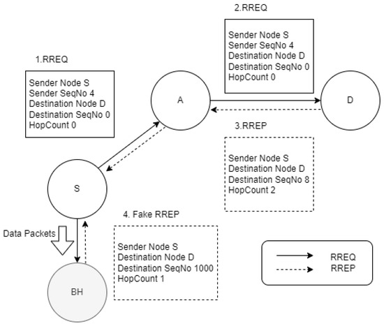 Next, the behavior of black hole attacks is described. An attacking node that receives an RREQ packets broadcast to the network (hereinafter called a black hole node), then forges and route replay packets (RREP) with a large sequence number and a small hop value and sends them back to the source node. In AODV, the priority of a route is evaluated based on the sequence number of the packet and the hop value. Therefore, when a black hole node receives an RREP packet returned by a black hole node, it misidentifies the route through the black hole node as the latest route to the destination. Figure 1 shows an example of a black hole attack. The nodes are indicated as follows: S is the source node, A is the relay node, D is the destination node, and BH is the black hole attacker. The solid line shows the flow of RREQ packets, and the dashed line shows the flow of RREP packets. In this example, before the RREQ packet reaches the destination node D via the relay node A, the black hole node BH near the source node S sends a forged RREP packet back to the source node S. As a result, the source node S mistakenly believes that the black hole node BH is the route to the destination node D and establishes a route. All data packets sent after the establishment of the route are relayed to the black hole node BH, and the black hole node discards all data received. This causes a situation where the route is established, but the data do not reach the destination. Even if the source node S tries to establish the route again, it will end up in the same situation as long as the black hole node BH is present.
