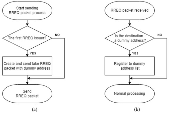 Each node requesting a route issues a forged RREQ packet containing an address that does not exist in the network based on its own address before issuing a normal RREQ packet and then flooding the network. When a node to which the proposed method is applied receives an RREQ packet, it determines whether the packet is forged based on its own address, the source address, and the destination address of the RREQ packet, then registers the packet in the dummy address list if it is determined to be a forged packet. Figure 2 illustrates the process flow when RREQ packets are sent and received.