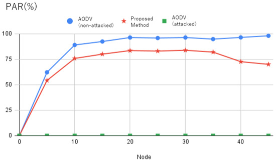 The PAR results show that the network employing the proposed method can efficiently communicate with a network employing the standard AODV routing protocol which is not under attack, although there is a slight degradation of performance compared to the network employing the AODV routing protocol. In contrast, regardless of the number of nodes, the attacked network has a PAR value of zero owing to communication breakdown.