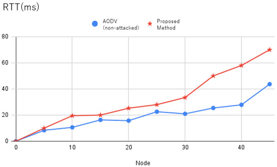 The round-trip time of the normal AODV protocol with attacks could not be measured; as shown in Figure 5, the packets did not reach the destination node. Therefore, we measured two AODV points, one indicating the proposed method with attacks and the other indicating the normal AODV protocol without attacks.