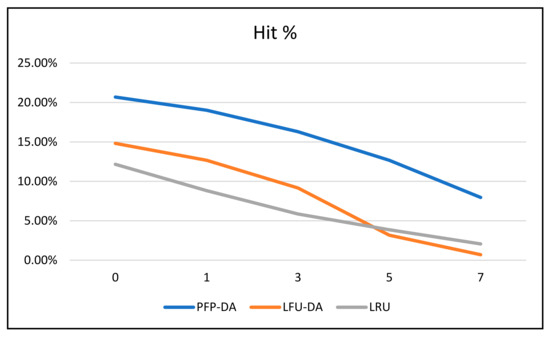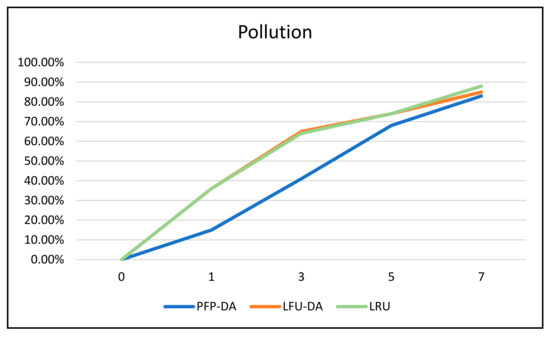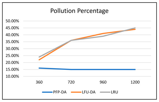 Figure 6, the pollution percentages for LFU-DA and LRU remain very similar, with PFP-DA outperforming both from about the 10% up to the seven-attacker (70%) scenarios. At around the higher percentage of attackers, the gap closes substantially as PFP-DA is overcome with cache pollution.
