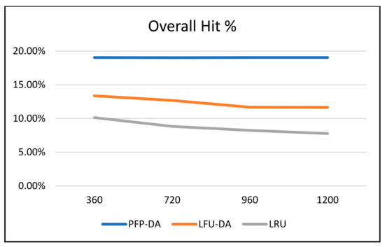 Figure 8. Both the overall and top 50 item hit rates take on very similar shapes, graphically. LRU, largely by coincidence, overtakes LFU-DA around the 50% attacker mark. This is largely because LFU-DA is based on request frequency, while LRU is not. Therefore, LRU depends entirely on recency and is affected only due to attacker content being more recently accessed as the number of attackers increases. Thus, the LRU data are arguably affected indirectly, whereas LFU-DA and PFP-DA are primarily affected by frequency, which means they are directly affected by incoming frequencies.