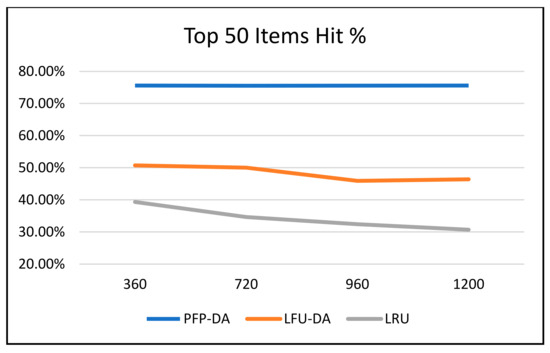 There remains no question, however, as to which algorithm performs best. PFP-DA maintains the highest percentage of overall hit rates. Considering the top 50 items, PFP-DA has anywhere from a 20 to 30% better hit rate than LFU-DA.