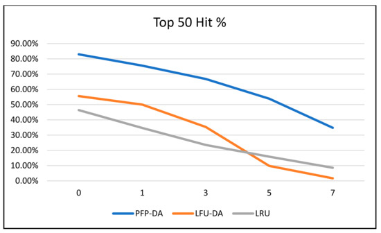 The difference between PFP-DA and both LRU and LFU-DA is remarkable. Even as the number of attackers increases, and PFP-DA is affected, it still performs substantially better than LRU and LFU-DA. We note that PFP-DA has a better hit rate (overall) by 5–9% during the increase in attacks. Even more interesting is that PFP-DA still maintains an almost 35% hit rate for the top 50 items, even as LFU-DA is entirely overwhelmed.