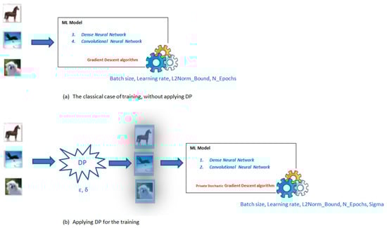 In this work, we put effort into elaborating on the work presented in [15]; more precisely, we investigate how several parameters of the ML model affect the accuracy of the model when applying DP to the training dataset. In this respect, an extensive set of experiments was carried out, focusing on two different network architectures (“dense” and “cnn”) with two different sets of input data that are well-known in the literature, namely, the MNIST dataset for handwritten digit recognition [60] and the CIFAR-10 dataset, which consists of color images classified into 10 classes, such as ships, cats, and dogs [61]. For each combination (i.e., architecture/dataset), we applied two different modes of operation of the machine learning algorithms (i.e., without the addition of noise and, for the DP, with the addition of noise) to accurately recognize the various characters with respect to the input dataset MNIST and to accurately recognize the various objects with respect to the input dataset CIFAR-10. Note that the “dense” architecture corresponds to a dense neural network, whilst the “cnn” architecture corresponds to a convolutional neural network. The ML algorithm used is the stochastic gradient descent algorithm.