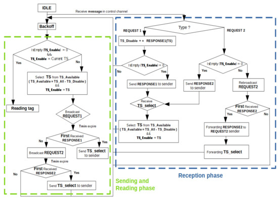 - The reader initiates tag interrogation using the data channel if there is an available TS in its table (IsEmpty(TSEnable) = 0). Otherwise, it selects an available TS from the list and stores it in TSEnable.