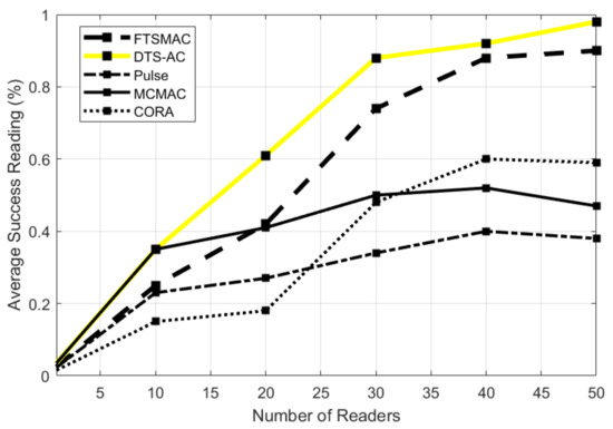 Figure 6 illustrates the significant improvement of DTS-AC compared to FTSMAC across various numbers of reader deployments. Since DTS-AC minimizes the RTI collisions affecting the FTSMAC protocol, its schema-based collision management consumes more Time Slots. As the number of readers increases, the system’s reading efficiency experiences a significant improvement, with efficiency reaching 88% when 30 readers are present. Subsequently, as the number of readers continues to increase, the reading efficiency approaches almost 100%, indicating a near-perfect performance. The frequency and time resource distribution technique employed by both DTS-AC and FTSMAC demonstrates exceptional system performance, surpassing that of Pulse, MCMAC, and CORA protocols.