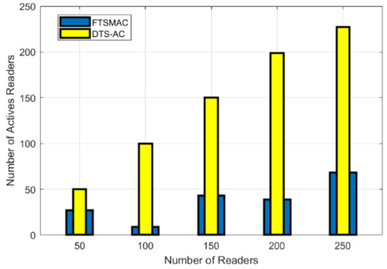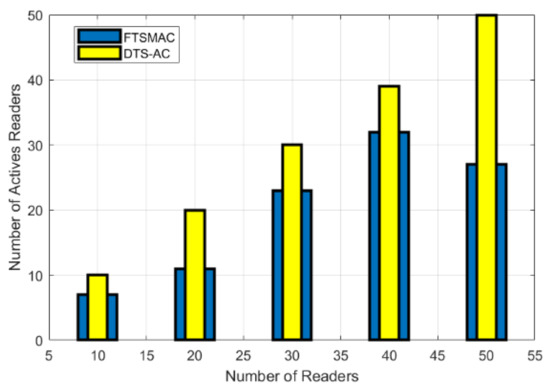 Figure 7 confirms the superior performance of DTS-AC regarding the number of active readers, demonstrating that almost all readers in the simulation can be activated and utilize the data channel without collisions. Both protocols exhibit symmetrical evolution, with DTS-AC showing a slight advantage of three to nine drives. However, a notable deviation between DTS-AC and FTSMAC becomes apparent at 50 readers, indicating DTS-AC’s more effective collision minimization while maintaining robust RRI processing and enhancing the RTI resolution process.