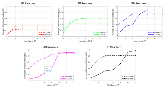 Figure 9 illustrates the system’s efficiency across various numbers of readers (ranging from 10 to 50) and the utilization of time slots (from one to seven TSs). DTS-AC consistently outperforms FTSMAC in all scenarios, with performance differentials ranging from 12% to 18%. Remarkably, even with the escalation in reader deployments, DTS-AC sustains its superiority, achieving a performance peak of 98% with 50 readers. This highlights the critical role of time slot control by DTS-AC in optimizing system efficiency amidst varying network densities and demands.