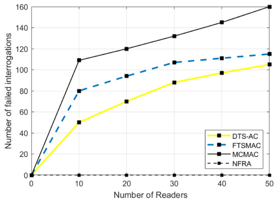 Considering the cost of the solution, Figure 10 shows the number of failed reader interrogations. It is evident that DTS-AC minimizes the delays required for readers to interrogate all tags in the network, with delays ranging up to 5 s for 50 readers. In contrast, FTSMAC exhibits a longer delay of 1.5 s and an increased number of failed interrogations, reaching 120 for 50 readers. NFRA, a centralized algorithm, exhibits longer interrogation times due to control messages exchanged between the reader and server, but with no failed interrogations. MCMAC shows similar delays to FTSMAC initially but exhibits the highest number of failed interrogations, reaching 160 for 50 readers.