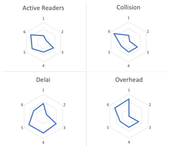 The following analysis provides a comprehensive examination of the complexity associated with each element of this protocol (Figure 11), based on the provided parameters and their respective weights. Each element, including Active Reader, Collision, Delay, and Overhead, is dissected to understand how various factors contribute to the overall complexity of the protocol. By examining the dependence of parameters such as the number of readers and frequency, time slots, and canal ranges, this analysis aims to shed light on the intricacies of the protocol, enabling a deeper understanding and potential avenues for optimization. Let us delve into the detailed analysis of each element: