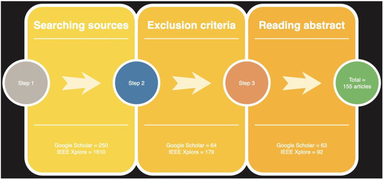 Figure 1 shows each step of the SLR process in one simple and clear image to obtain the picture in one glimpse. First was the searching of the two databases, Google Scholar and IEEE Xplore, and the number of papers at that point. The second step, after applying the exclusion criteria, left 64 papers in Google Scholar and 179 in IEEE Xplore. The last step was reading the abstracts, which resulted in 63 papers in Google Scholar and 92 documents in IEEE Xplore, for a total of 155 papers for the review.