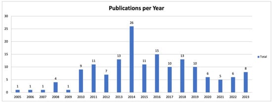 The first question includes the number of publications per year found among the papers included in the SLR. A total of 155 papers were included from the period from 2004 to 2023. As it is shown in Figure 2, most of the publications were between 2010 and 2019, with 2014 having the highest number of papers. The main topics in that period revolved around security, sensors, cellular, and vehicular networks. This is a clear demonstration of the interest of finding ways to use this technology in new scenarios to penetrate the market of mobile and wireless technologies even in city areas where telecommunication infrastructure is present, clearly to reduce the costs of data transmission. A key aspect to overcome is to make the interoperability seamless for the final user.