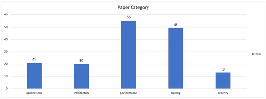The results show not only the main categories for the issues addressed in the papers, performance, routing, applications, and architecture but also include the papers that focused on security. Figure 3 below shows the number of papers per category.