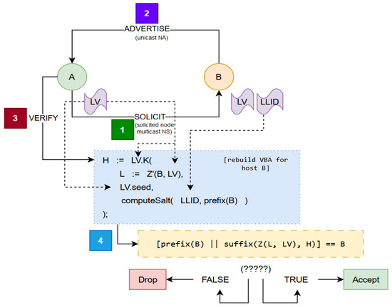 During step 1 from the Figure, Node A can choose to attach a source link-layer address option (SLLAO) to its solicitation, which will cause Node B to verify its binding with the IP Sender Address from the NS packet. The Z’ function returns the L value (iteration count) embedded within Node B’s address. This function is the opposite of Z from the address generation process: it uses an input address to determine L rather than using an input L to determine an encoded hextet. Despite the different inputs, the naming alludes to the opposite purposes for each function.