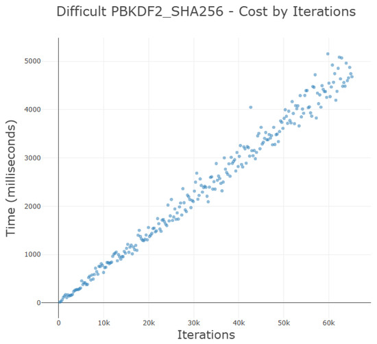 A high-difficulty setting with the PBKDF2_SHA256 algorithm (an ITERATIONS_FACTOR of 256) shows a mostly linear relationship between the baseline time required to generate a VBA and the input iteration count. The data gathered is not an averaged composite of multiple runs. As the iteration count increases, variations in the baseline computation time increase.