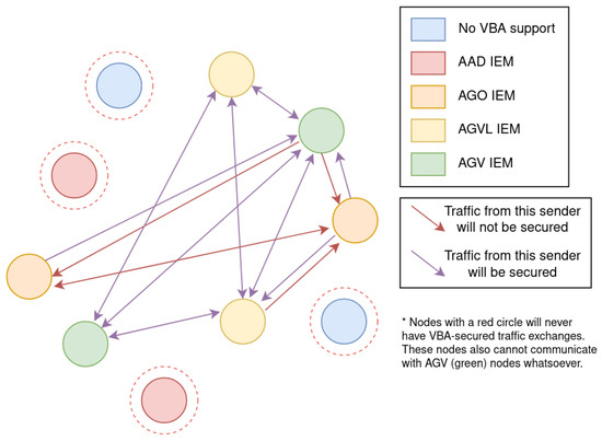 A mixed local network is shown where a single valid Link Voucher is delegated to VBA-capable neighbors. Neighbors without VBA capabilities are shown in blue, and VBA-aware neighbors are shown in red, orange, yellow, and green for the IEMs AAD, AGO, AGVL, and AGV, respectively. Different links are shown between some hosts to indicate their connectivity and security within this transitioning network. Inbound traffic to verifying nodes is generally considered secure.