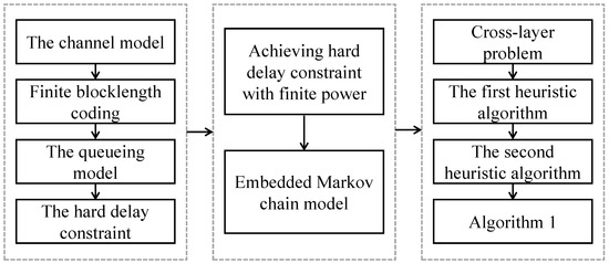 The rest of this paper is organized as follows: Section 2 illustrates the system model. The finite blocklength coding with a cross-layer approach is investigated in Section 3. In Section 4, a heuristic algorithm is proposed to obtain the hard delay constraint policy. Numerical results and concluding remarks are presented in Section 5 and Section 6, respectively. The research flow chart of this paper is shown in Figure 1.