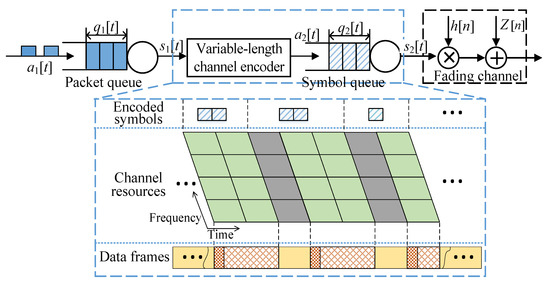 The encoded symbols are buffered in a symbol queue and transmitted over a time-varying fading channel across multiple time slots. The symbol queue’s length is defined as the number of symbol blocks backlogged in the symbol queue in the t-th time slot. Each symbol block spans T s and B Hz in the time and spectral domains, respectively. Subsequently, the arrival rate of the symbol queue is defined as the number of symbol blocks that arrive. The service rate of the symbol queue is defined as the number of symbol blocks transmitted in the t-th time slot. Consequently, the evolution of the symbol queue is defined as