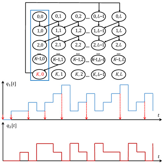 where , and K is the maximum queue length constrained by the buffer size. Moreover, denotes the service rate in terms of the number of data packets transmitted in time slot t.