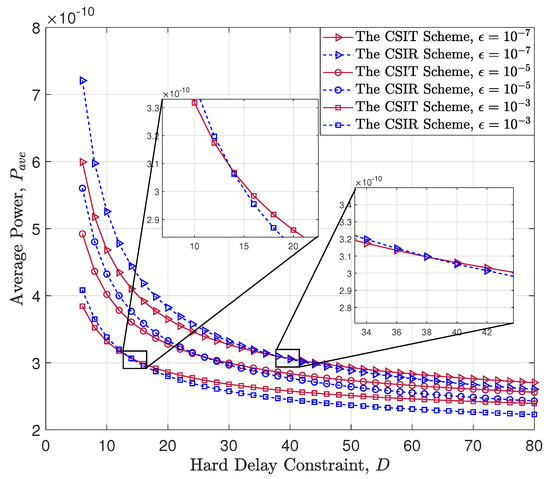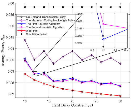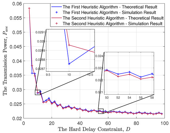 Figure 6 illustrates the performance of two heuristic algorithms as the upper limit of the hard delay constraint varies. With an increase in the hard delay constraint, the number of system states also increases, thereby slowing down the convergence of the gradient descent method. Thus, only the results of the heuristic algorithms are displayed. As observed, when the upper limit of the hard delay constraint increases, the average power consumption decreases. This phenomenon can be explained from two perspectives. Firstly, a higher hard delay constraint provides more time slots for transmission, enabling the selection of better-quality channels and, consequently, reducing power consumption. Secondly, with a high hard delay constraint, more data packets can be accumulated for transmission, resulting in a longer coding blocklength, further contributing to the reduction in power consumption.