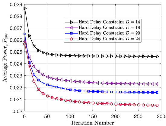 Figure 7 depicts the change in average power consumption as a function of the iteration number of the gradient descent policy. As the iteration number increases, a deceleration in descent speed is observed, pointing to an eventual convergence. Notably, the rate of convergence of the gradient descent policy slows down with increases in the hard delay constraint. This slowdown can be attributed to the scale of the Markov chain states and the scale of the channel truncation threshold parameters. The increased number of parameters leads to a slower convergence rate. Consistent with the observations in Figure 4, Figure 7 also illustrates a gradual decrease in average power consumption with an increase in the hard delay constraint.