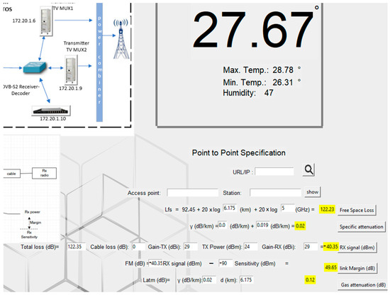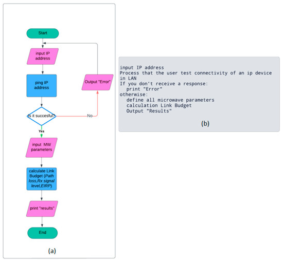 The proposed tool is designed to describe and analyze a specific local network, control the connection of all the IP devices of the local network, calculate all the propagation parameters, and ensure that the signal arrives strong enough for the receivers. In Figure 1, the application starts and the user has to enter the IP address to check the IP device’s connectivity. If the IP device is connected, the user can insert the microwave parameters in the input. Then, the user clicks the button and the tool executes the calculation and displays the result.