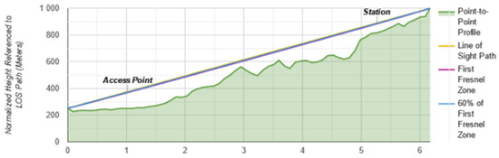 In this section, two experimental scenarios based on real wireless Ethernet bridge connections are analyzed from point to point, as shown in Figure 2. The height of the TX antenna is 25 m at Aghia Paraskevi (Access Point), and the RX antenna is 55 m high on the transmission tower of Mount Hymettus (station). Both terrestrial microwave points are part of the Hellenic Broadcast Corporation, which is the state-owned public radio and television broadcaster of Greece. The microwave transmission parameters are provided in Table 1, where both the transmitter and receiver in the link have the same types of antennas. For these experiments, the equipment of the transmitter and the receiver operates in the C and X bands. They are both supplied by the company Ubiquiti Networks. The names of the models are PowerBeam and AirFiber AF-11, and their specifications are described in the relevant datasheets [14,15]. The two microwave systems use the Time Division Duplex (TDD) method to send and receive data using a single radio channel. Figure 3 displays the path profile between the transmitter (Access point) and receiver (station) sites.