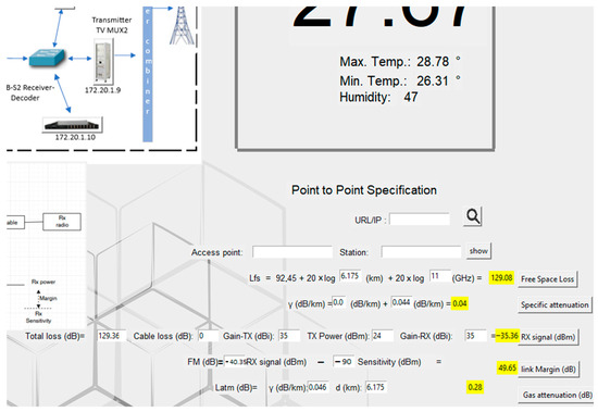 In the second scenario, the Tx power is 24 dBm, the Tx cable loss is 0 dB, the Gt antenna gain is 29 dBi, the Gr antenna gain is 29 dBi, and the total path loss is 129.36 dB. At a distance of 6.175 km, the receiver signal power is calculated as −47.36 dBm and the link margin as 42.64 dB, as shown in Figure 5.