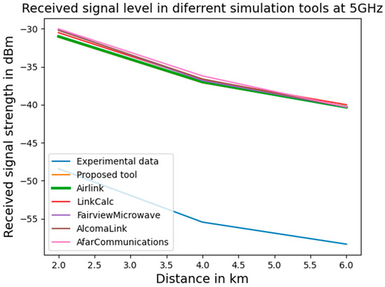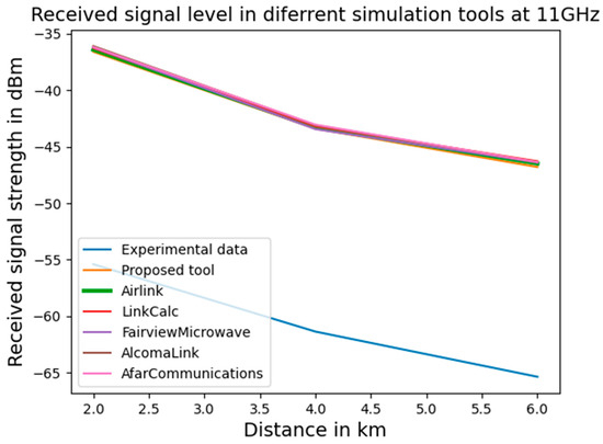 In the next phase, the link budget is calculated using the proposed tool and the same parameters are also inputted in the Airlink, LinkCalc, AfarCommunications, AlcomaLink, and Fairview microwave simulations. Figure 8 and Figure 9 show the variation in the received signal level at the maximum distance. As rule, as distance increases, the strength of the signal received weakens. The parameters of the five simulation tools have little difference, so the proposed scenario is verified by all five simulation tools. For demonstration reasons only we have also submitted in the same diagram the real-experimental curve of the assembly mentioned earlier, though in real life there are certain legal constraints, mainly because in practice the transmitted power is adjusted to around 6 dBm to be in compliance with the ETSI standard [16] (the E.I.R.P value limit is set below 1 W in Europe for frequencies at 5 and 11 GHz). As shown in Figure 8 and Figure 9, all seven curves have the same inclination and degradation degree, but in different levels of received signal strength.