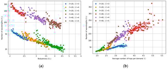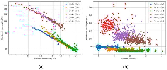 Figure 1 and Figure 2 show the average number of wavelengths N λ required to satisfy a full-mesh logical topology as a function of different topological parameters. These are based on a set of 7000 random networks with 20 and 40 nodes, an average node degree of < δ > = 3, 4 and 5, and uniform traffic. From these figures, one can see that the wavelength requirements, N λ , decrease as algebraic connectivity and the robustness increase. This behavior is expected since a G is related to R G ,   in the sense that higher robustness values indicate the availability of more node-disjoint paths. Therefore, as the number of available paths increases, the wavelength requirements decrease. In contrast, the opposite trend is observed when the average number of hops per demand increases. This occurs because a network with high < h > values implies that, on average, each traffic demand travels over more links, increasing link loads and potentially leading to wavelength conflicts on these links. Finally, from Figure 1b it appears that wavelength usage does not exhibit any correlations with the spectral radius, and no clear trend can be identified.