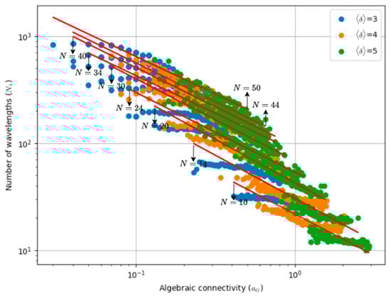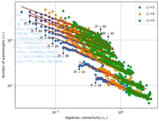 In this context, we obtained Figure 4, which depicts the number of required wavelengths   ( N λ p ) as a function of algebraic connectivity with the number of nodes and the average node degree as parameters. The data set considered is the same as in Section 4.2. The results show that the number of wavelengths   N λ p is still correlated with algebraic connectivity. However, compared with Figure 3, the power-law relationships are less evident. Therefore, the linear trend lines in the log-log graph do not fit the data points as well as they do in the unprotected case. Despite this, we still used these trend lines to derive the following prediction formula: