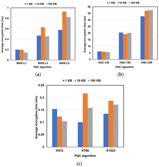 As shown in Figure 9b, when the signature algorithm F1024 was paired with each KEM algorithm, the total processing time ranged from to , with most of the algorithms achieving processing times similar to when the KEM algorithm was paired with F512. BIKE-L3-F1024 () and K1024-F1024 () achieved the lowest processing times compared to the other algorithms. However, slightly higher processing times were observed for the PQC standalone protocol. According to the results in Figure 9c, the CRYSTALS-Kyber algorithms achieved higher processing times for K512-F512 (), K768-F512 (), and K768-F512 ().
