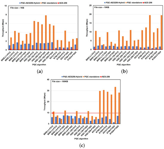 Furthermore, as shown in Figure 11b, a similar trend was observed for the KEM algorithms paired with F1024, with almost all the algorithms achieving a slightly lower total throughput compared to the performance of AES-256, except for K1024-F1024, which achieved the highest total throughput of , an increase compared to conventional AES-256. The pairs BIKE-L3-F1024, BIKE-L5-F1024, HQC-128-F1024, and K768-F1024 achieved the lowest total throughput of approximately () compared to all the other algorithms.