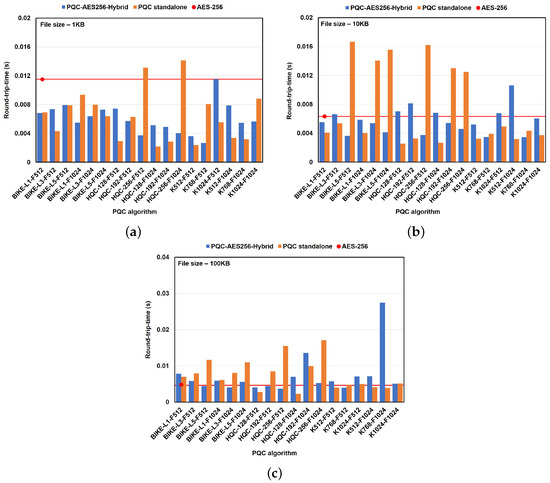 The end-to-end delay likely to be introduced by the proposed protocols was measured using the average RTT. It was expected that a delay for small, bursty messages, including delays due to encryption, network transit, and decryption, might occur. Therefore, the RTT, which is important in interactive chat, was considered. Figure 10 shows the average RTTs of the end-to-end delay of the proposed protocols. It was observed that the proposed protocols achieved better performance than conventional AES-256, which had an average RTT of . According to the results shown in Figure 10a,b for the hybrid protocol, an average RTT of less than was observed for all algorithms, except for K512-F512 (), K768-F512 (), and K512-F1024 ().