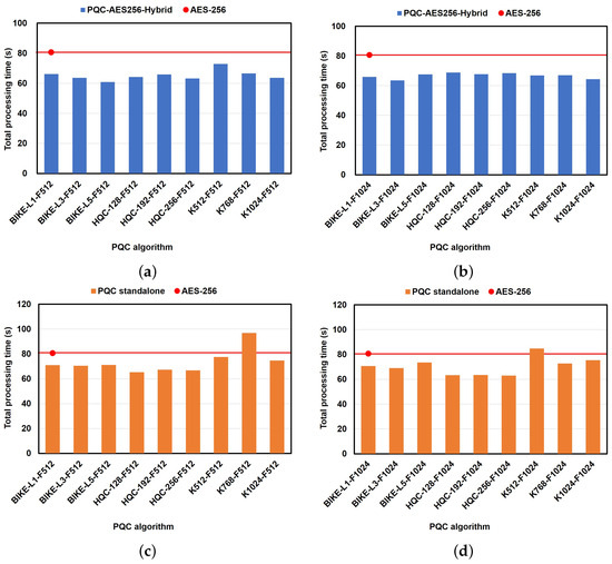 A similar trend was observed when F1024 was used, as shown in Figure 9d, with a lower processing time for K768-F1024 (), while the time increased for K512-F1024 (). The HQC algorithms maintained almost consistent processing times compared to the hybrid protocol, with slight variations of less than . Conversely, BIKE experienced higher processing times in the PQC standalone protocol than in the hybrid protocol but lower processing times than the conventional AES-256 algorithm, as shown in Figure 9a,c. With the exception of K768-F512 and K512-F1024, which achieved higher processing times than AES-256 in the PQC standalone protocol, all algorithms in this mode experienced lower overheads and are expected to function effectively without adversely impacting the QoS of a chat-based application.