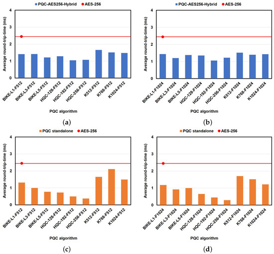 In the PQC standalone protocol, a lower delay was observed for most of the PQC algorithms, with the exception of CRYSTALS-Kyber, compared to the hybrid protocol. Figure 10c confirms that the average RTT decreased with the increase in the KEM security level for most of the PQC algorithms, ranging from to , except for K768-F512, which had a higher average RTT of , slightly closer to that of AES-256 (). As shown in Figure 10d, a similarly lower average RTT trend, decreasing as the security level increased, was observed. However, there was a slight variation in the pattern for the BIKE algorithms compared to the hybrid protocol. It was confirmed that BIKE-L5-F1024 increased slightly to . It was further confirmed that HQC-256-F1024 achieved the lowest average RTT of .