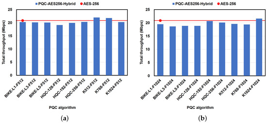 Live streaming total throughputs: (a) PQC–AES-256 (with F512). (b) PQC–AES-256 (with F1024).
