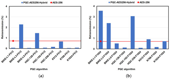 As shown in Figure 12b, in comparison to the algorithms paired with F512, the KEM algorithms paired with F1024 exhibited an opposite trend, with the exception of HQC-192. According to the results, HQC-192-F1024 achieved a retransmission rate of , which was higher than that of HQC-192-F512. Similarly, a downward trend was recorded for CRYSTALS-Kyber as the security level increased, which differs from the retransmission rates observed when the KEM algorithm was paired with F512. K512-F1024 achieved the highest retransmission rates of , which was higher than that of K512-F512 by while K768-F1024 and K1024-F1024 achieved lower retransmission rates of and than K768-F512 and K1024-F512, respectively. It was further confirmed that BIKE-L5-F1024 (), HQC-128-F1024 (), and K512-F1024 () all achieved higher retransmission rates than conventional AES-256. This suggests that further optimization may be necessary in order to use these algorithms effectively in real-time applications.