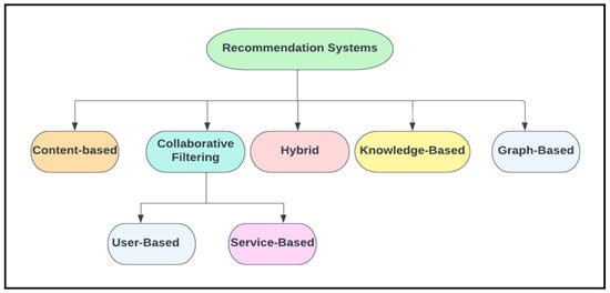- Graph-Based RS—Represents users and services as nodes in a graph, where edges denote interactions or recommendations; a random walk through the graph helps identify the most relevant service.