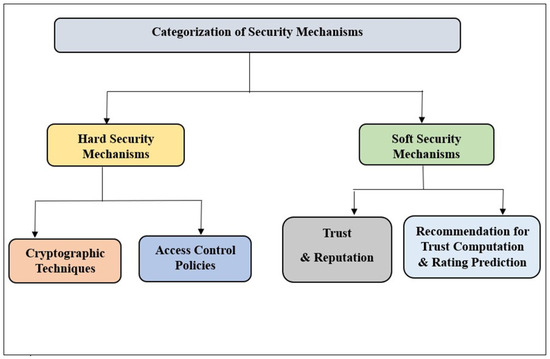 Given the multi-tenant nature of cloud systems, the attack surface is significantly expanded, increasing the risk of unauthorized access and malicious activity. Traditional access control models—such as those based on Access Control Lists (ACLs)—define user permissions according to predefined roles and attributes. However, these models are typically static and do not consider the dynamic trustworthiness of users and roles involved in service interactions. Security in cloud computing is generally categorized into hard and soft security mechanisms. Among hard security approaches, cryptographic techniques and access control policies remain the most widely adopted solutions for ensuring data confidentiality, integrity, and controlled access. In contrast, soft security mechanisms emphasize trust management and recommendation-based trust computation, providing adaptive, behavior-driven protection that complements hard security. Incorporating trust values into access control mechanisms is increasingly recognized as an effective means of enhancing the resilience and security of cloud computing environments, thereby safeguarding the integrity of data owners’ assets. Figure 2 illustrates the various security mechanisms employed in cloud systems.