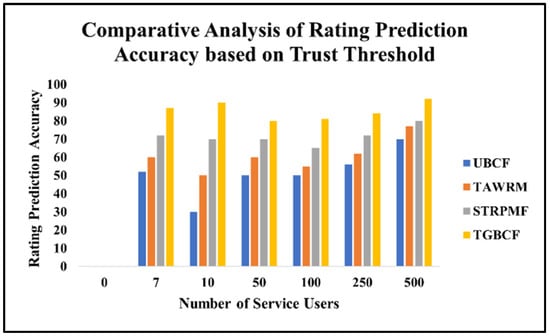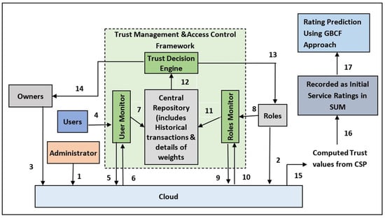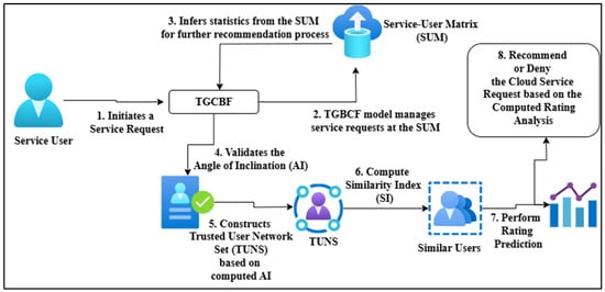 The system architecture of the TGBCF model incorporates a structured communication framework to ensure secure access control and trust management in a cloud environment. An architectural diagram of the proposed hybrid recommendation model is presented in Figure 4. The model integrates graph-based trust computation with collaborative filtering techniques to construct a Trusted User Network Set, compute similarity using Pearson’s Correlation Coefficient, and generate reliable service ratings by isolating malicious feedback through comprehensive trust evaluation.