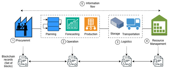 Supply chain management consists of five core functions—procurement, operations, logistics, resource management, and information flow [46]—all of which can be enhanced through blockchain integration, as shown in Figure 6.