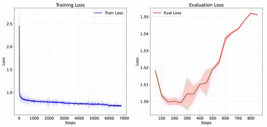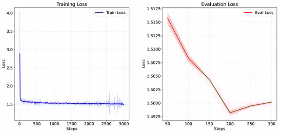In order to alleviate the above problems, we introduce two improvement strategies: one is to adopt an early stop mechanism [34] to prevent overfitting caused by an excessively long training process, which terminates training if the validation loss does not improve for 10 consecutive epochs; the other is to replace the original simplified noise disturbance with Gaussian white noise, so as to simulate the network traffic fluctuation more realistically. Figure 4 shows the training loss and the evaluation loss after optimization. It can be observed that the application of these strategies does not significantly impact the training loss, which continues to converge, demonstrating the model’s ability to effectively learn the optimal solution. Meanwhile, the evaluation loss shows an overall downward trend. When the loss increased, the early stopping strategy was triggered promptly, effectively avoiding overfitting.